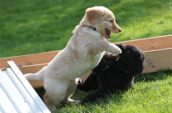 Alle Spielgeräte werden ausgiebig benutzt und auch die Hosenbeine und Ärmel der Welpenbesucher werden gerne für Zerrspiele zweckentfremdet. :-)