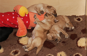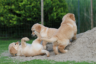 Es ist eine wahre Freude die Kleinen im großen Welpengarten zu beobachten. Sie sind unerschrocken und neugierig und alle Welpenspielgeräte werden sofort und ausdauernd in Beschlag genommen. Sei es die Hängebrücke, der 4-Fach-Tunnel, das Wackelbrett, das Hamsterrad.... alles wird ordentlich genutzt und sind sie mal müde, so schlafen sie sehr gerne auf der überdachten Terrasse oder unter der Hängebrücke und verarbeiten dort ihre Erlebnisse in wilden Träumen.