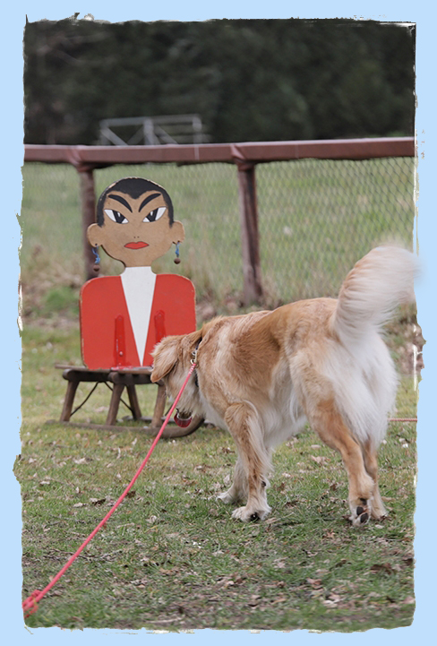 Was war noch spannend und neu für mich?! Es kam zum Beispiel ein Schlitten mit einer merkwürdig grinsenden Person auf mich zugefahren, ein Overall wurde an einem Pfahl hochgezogen, eine Kette knallte aufs Blech, ich musste zu Meike in die Gruppe rennen, es wurde zwei Mal geschossen und ich habe eine Pilzsammlerin auf dem Hundeplatzgelände getroffen.